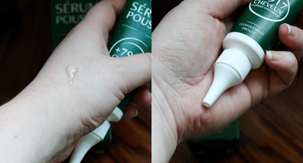 Selon le packaging, il faut « appliquer une à deux noisettes, deux fois par jour sur le cuir chevelu et faire pénétrer par massage circulaire. ». Comme je le disais précédemment, l’application est facile grâce à son embout précision, on peut l’apposer directement sur le cuir chevelu pour cibler plus facilement une zone ou disposer la juste quantité voulue. Premier point positif selon moi. Quand j’ai lu qu’il ne fallait pas rincer, j’avais un peu peur de l’effet gras mais au final en massant bien, le produit est rapidement absorbé. C’est donc un deuxième point positif.