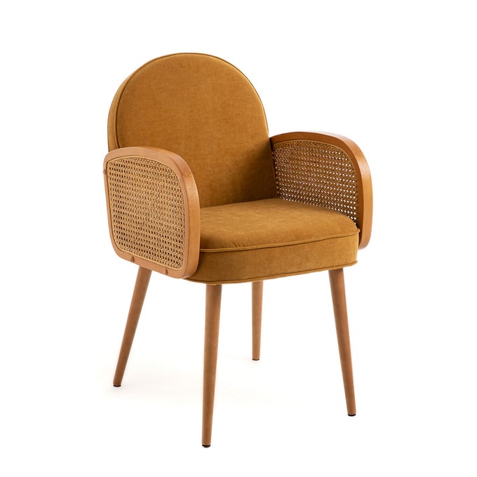 - Fauteuil de table en velours et cannage Buisseau Ocre Doré chez La Redoute – 358€