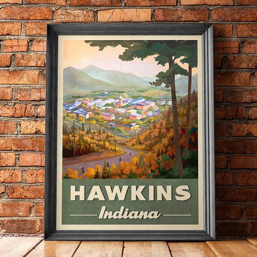 - Affiche sous cadre Hawkins Indiana Travel Poster chez Windowshopgal.com – $24,50