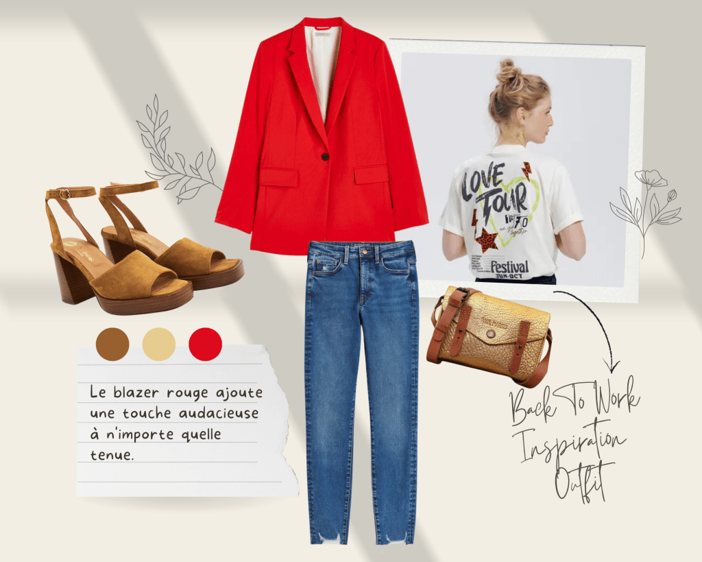 Sandale à talons Aimée en cuir suede camel Bons Baisers Paris 185€ / Jean skinny True To You bleu denim H&M 49,99€ / Blazer à fermeture droite rouge H&M 39,99€ / T-shirt à message love écru – Promod 17,99€ / Mini sac en cuir bandoulière LeMini Indispensable doré – Paul Marius 55€