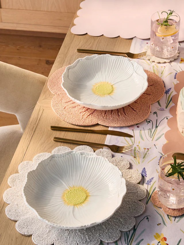 Pour cette sélection, j’ai opté pour des tons pastel avec des éléments naturels comme des bouquets de tulipes ou des pots de primevères pour apporter une touche de vie à chaque pièce. Les textiles légers, les coussins en lin, les nappes en coton et les rideaux vaporeux invitent à la douceur et à la sérénité. On n’oublie pas les détails : des bougies parfumées aux senteurs florales, des paniers en osier pour ranger avec élégance, ou encore des motifs inspirés de la nature – papillons, feuilles, fleurs – pour une ambiance résolument printanière. Et pourquoi ne pas prolonger cette atmosphère jusqu’à la table ? Une belle vaisselle aux motifs fleuris, des sets de table en rotin et des centres de table floraux transforment chaque repas en un moment de convivialité.
